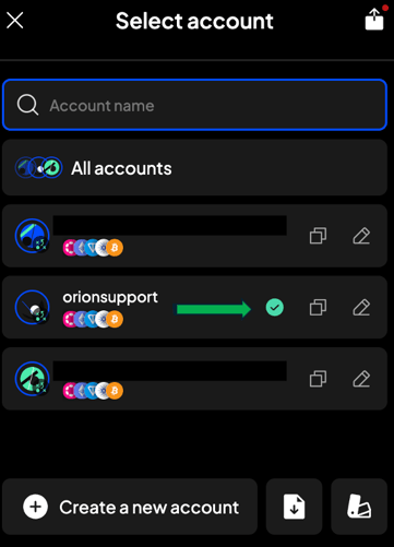 - Confirm the wallet you are using for the transfer is selected (you will see your account name in place of orionsupport)