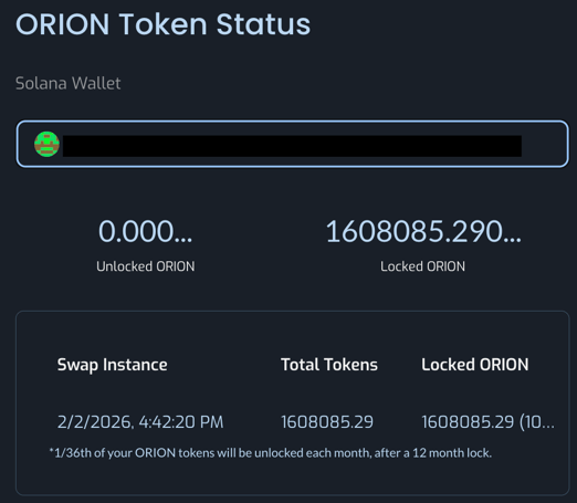 - Once the swap is complete you will be able to view the Token Status Page where you can confirm that your Legacy Bridge submission was successfully recorded and view your status of the ORION Architect token allocation