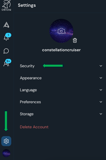 - Click on the settings icon and select Security.