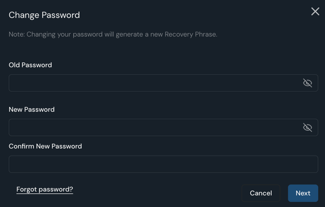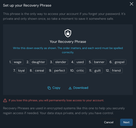 - You will be prompted to set up a new Recovery Phrase. Make sure not to lose this otherwise you won't be able to reset your password.