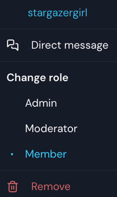 - Click the three dots to the right of the username and select Remove or change their role to Admin or Moderator.