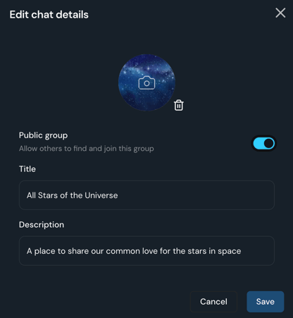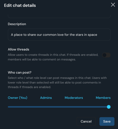 - You can choose to edit the group name, description, profile photo, make it searchable or not, turn on Threads, and edit who can post in the group.