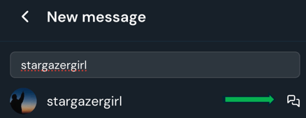 - Start typing in the username you'd like to chat with and click the two chat bubbles.